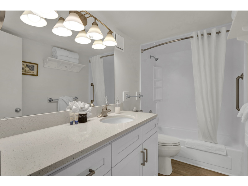 Relax in Style: The bathroom features a variety of bath amenities and a tub/shower combo with a grab bar for added safety.