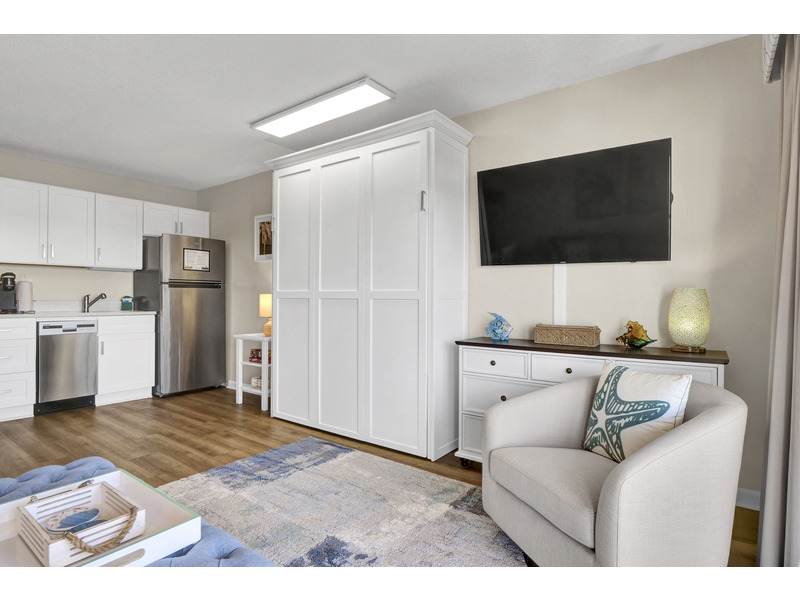 The king-size bed in the bedroom and the Murphy-style queen bed in the living room mean plenty of room to crash after a day of shredding or sunbathing. Two TVs make sure your crew doesn't fight over the remote, and the updated kitchenette is ready for action, with a full fridge, microwave & convection oven, two-burner cooktop, dishwasher, Keurig, and even an ice maker to keep your drinks chill. Pots, pans, and all the basics are included if you're feeling chef-y.