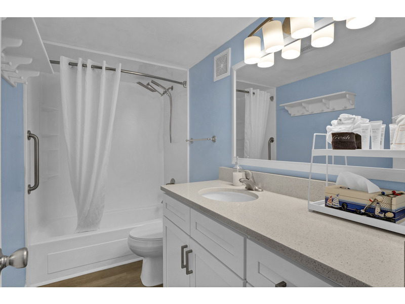 Relax in Style: The bathroom features a variety of bath amenities and a tub/shower combo with a grab bar for added safety.