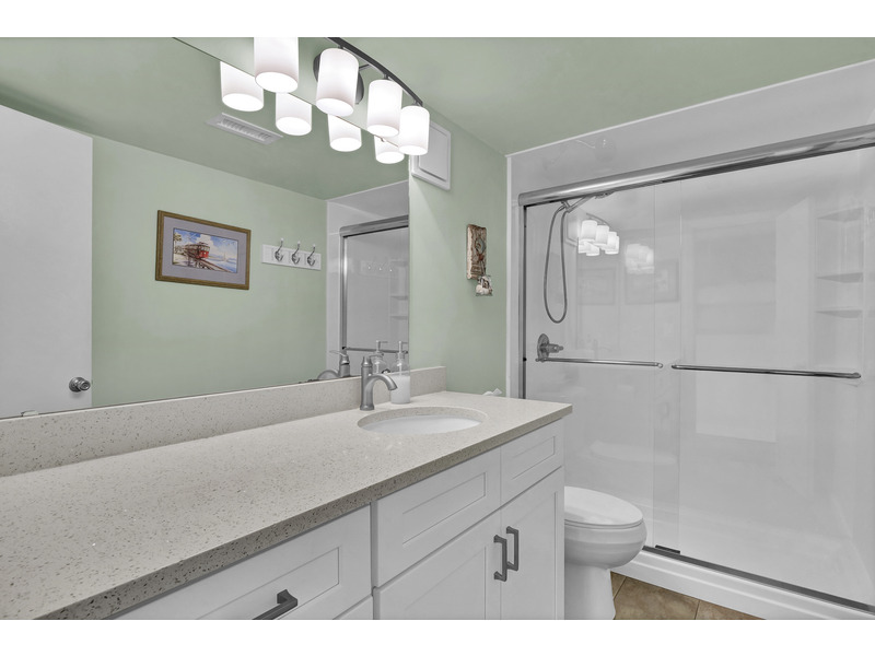 Relax in Style: The bathroom features a variety of bath amenities and a tub/shower combo with a grab bar for added safety, as well as a walk-in shower.