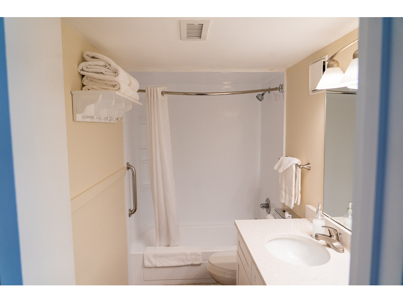 Relax in Style: The bathroom features a variety of bath amenities and a tub/shower combo with a grab bar for added safety.