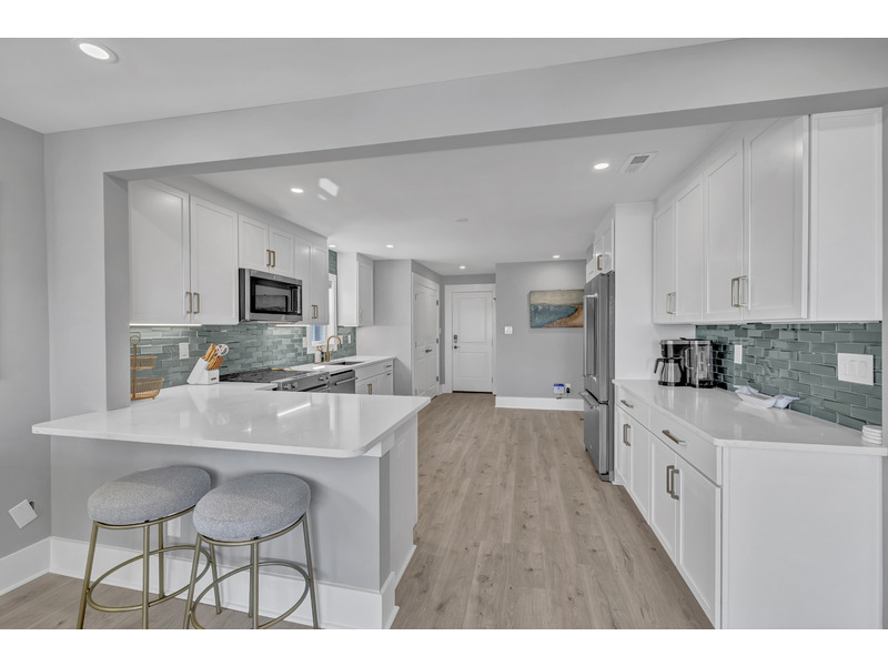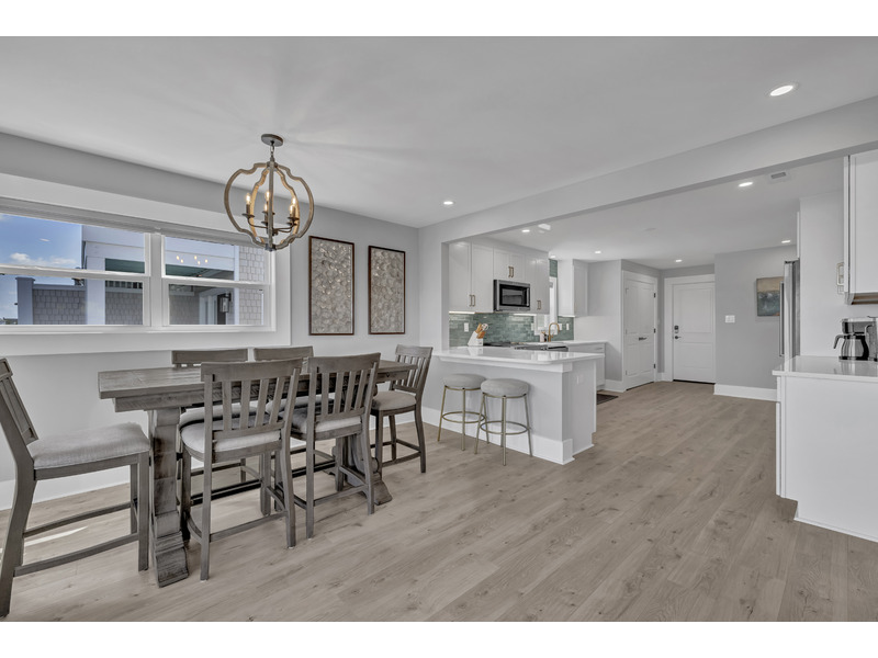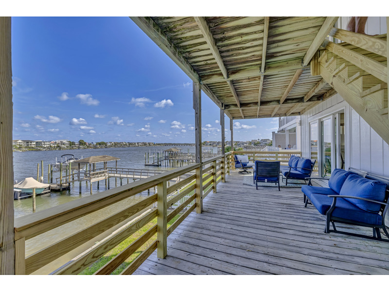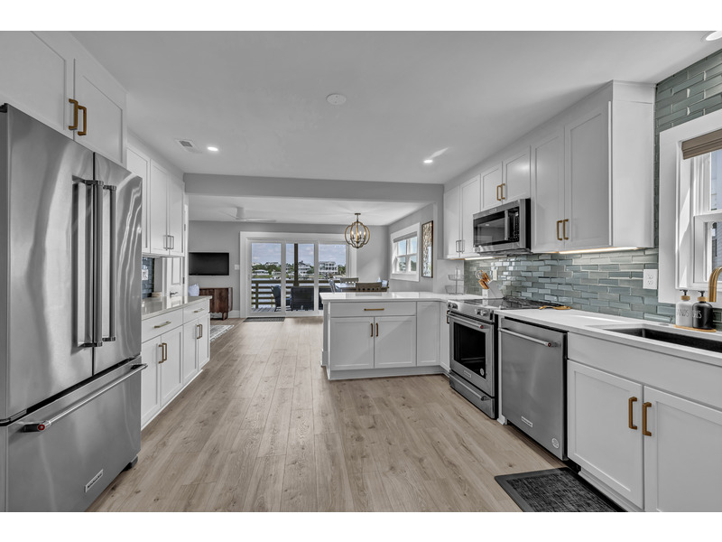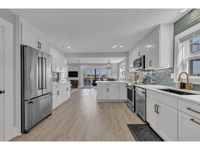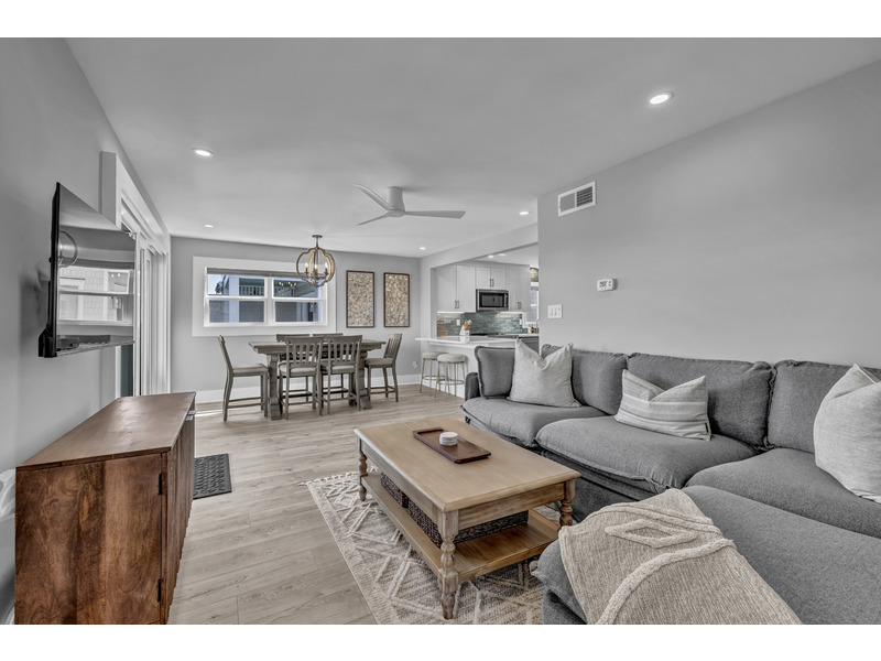 As you enter, the first thing you'll notice are the large sliding glass doors that flood the space with natural light and frame breathtaking water views of Banks Channel. The open-concept living area features a fully stocked, updated kitchen, dining area, cozy living room, and a designated workspace for those who need to check in while away.
