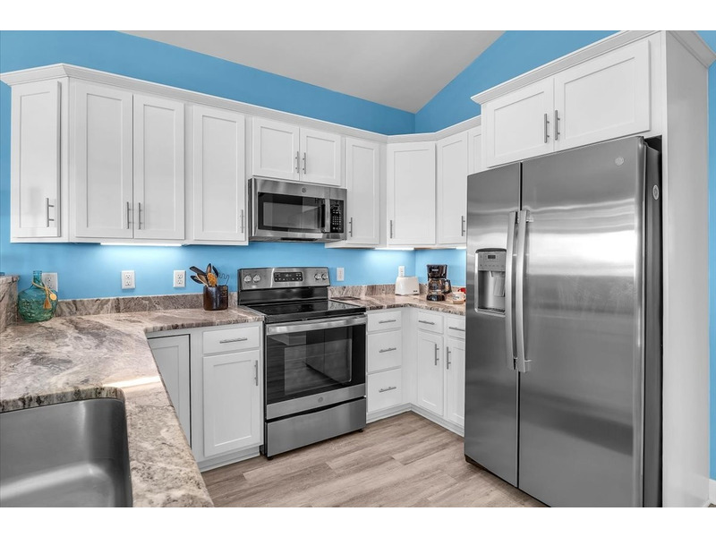 The living room offers three cozy loveseats and a large-screen TV, perfect for family movie nights. The dining area seats 6 with room for 3 more at the kitchen bar. The fully stocked kitchen features stainless steel appliances, granite countertops, and everything you need to prepare meals with ease.
