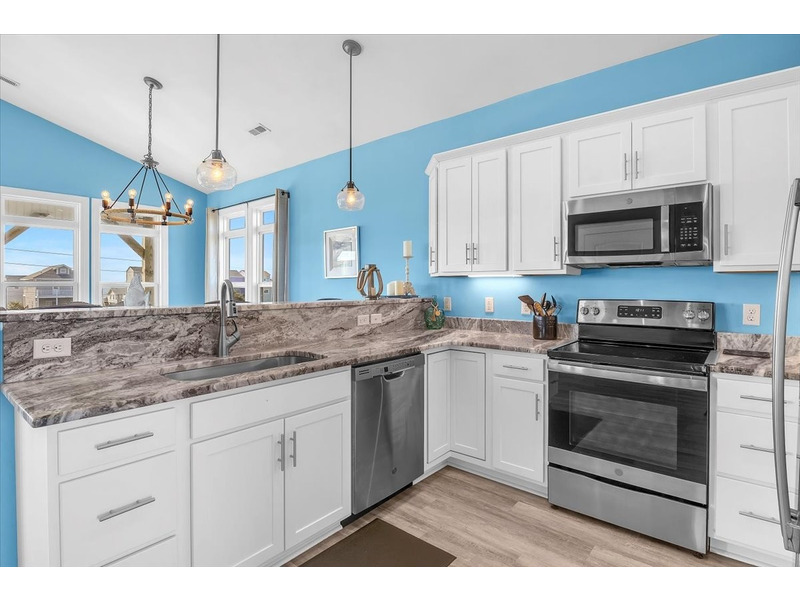 Outdoor living shines with two oceanside and two soundside decks, perfect for sunrises, sunsets, or dining al fresco. Amenities include beach chairs, a beach cart, picnic table, outdoor shower, and covered carport parking for up to three vehicles.