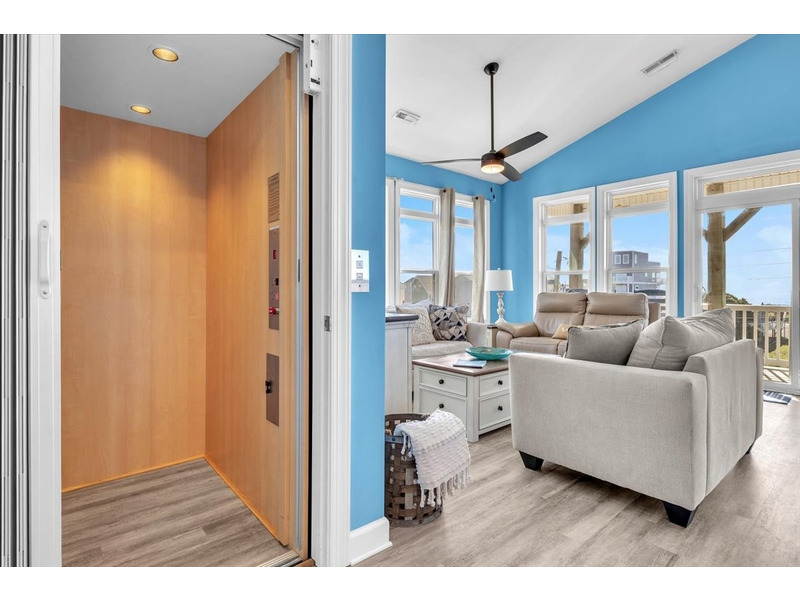Spanning over 1,700 sq. ft., the home features a reverse floor plan with front and back decks on every level and an elevator providing easy access to all floors. The upper level boasts an open-concept living, dining, and kitchen area, surrounded by windows that fill the space with natural light. Enjoy vaulted ceilings, French doors, and a covered deck with panoramic ocean views.