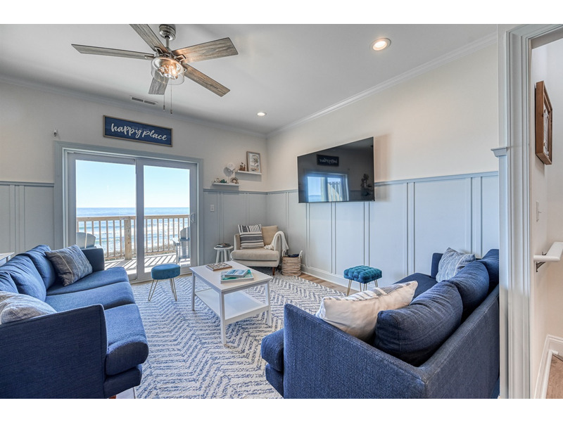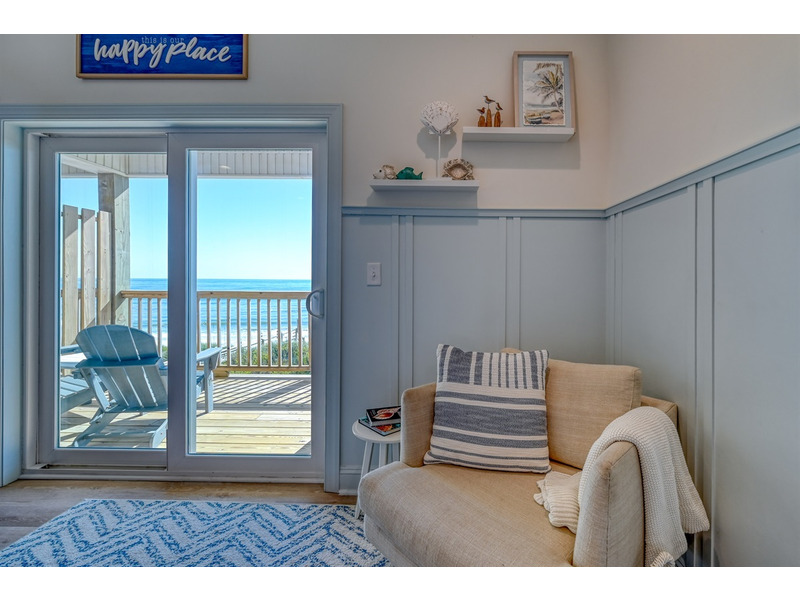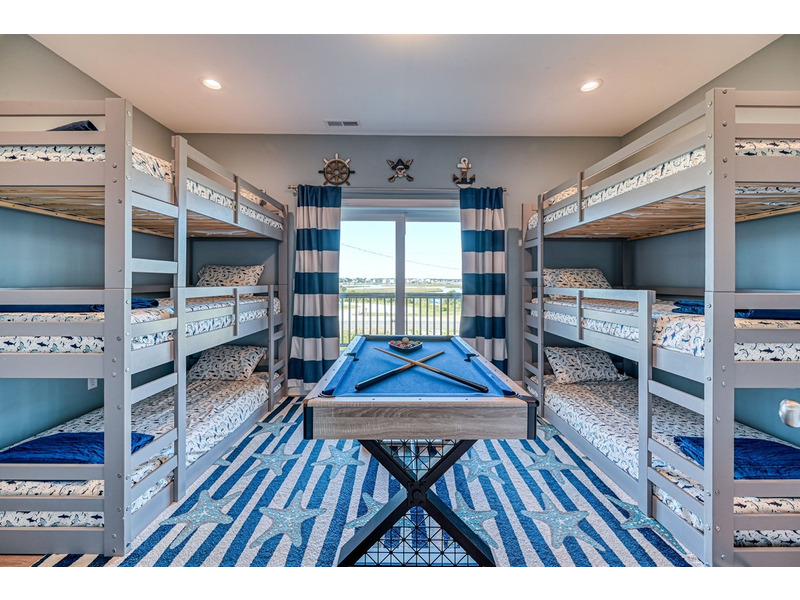 The oceanfront king ensuite with a twin sleeper and private balcony offers breathtaking views of the Atlantic Ocean. You can relax on the balcony, enjoy a cup of coffee, and watch the sunrise over the ocean. The king bedroom with a twin sleeper and sound side private balcony and the shared balcony downstairs is perfect for those who love to watch the sunset. The two additional bedrooms, one with a twin trundle and one with twin bunks, are perfect for families with children.