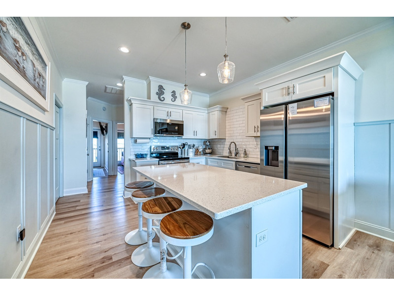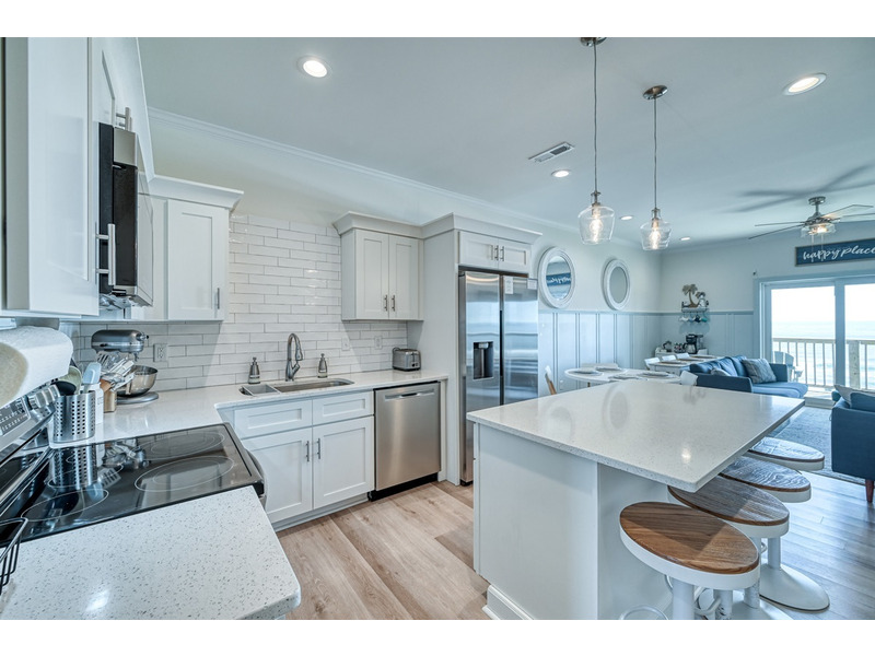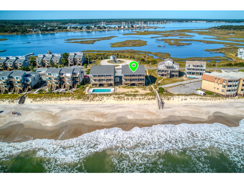 Stunning 4-bedroom, 3-bath townhouse. Breathtaking views. The pool (May-September) is shared between 6 townhouses in a private community. 1 king bed, 2 queen beds, (2) triple bunk beds (6 twins total) and 1 futon. Each of the 4 bedrooms has a private balcony with views of the ocean or sound. The open concept living room features spectacular views of the ocean. Kitchen boasts stainless steel appliances, quartz countertops, large island with seating for 4, dining room table with seating for 4 and an additional sofa table with seating for 3. Seating on upper oceanfront balcony for 4 with two connecting corner coffee tables. The balcony seating for 4 or indoor seating for 10. Well-equipped kitchen & elevator.