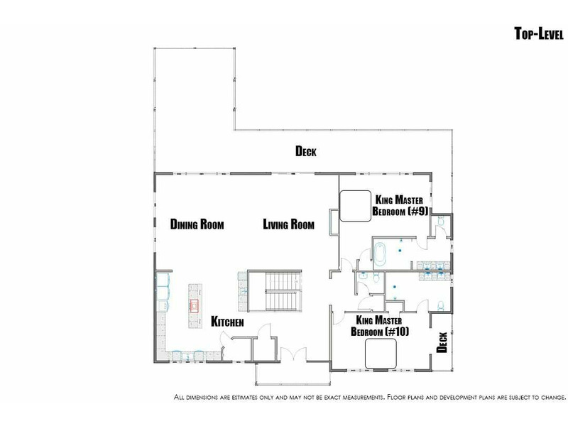 Top-Level: Living Room with Smart TV; Dining Room with 2 Tables (seats 12 each) and Wet Bar (mini-fridge and sink); Kitchen with Bar (seats 4), Blender, Coffee Maker (Drip & Keurig), 2 Dishwashers, Microwave, 2 Ovens, 6-Burner Gas Stove, 2 Refrigerators, Toaster, Pots, Pans, Dishes, and Cooking Essentials; King Master Bedroom (#10) with Smart TV, Deck Access and Attached Full Bathroom with 2 Sink Vanity; King Master Bedroom (#9) with Smart TV, Deck Access and Attached Full Bathroom with 2 Sink Vanity; Hall Half Bathroom.