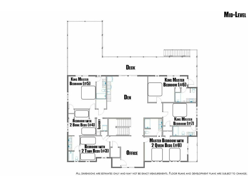 Mid-Level: Den with Smart TV, Kitchenette (microwave, refrigerator, and sink), and Deck Access; Master Bedroom with 2 Queen Beds (#8), Smart TV, Attached Full Bathroom with 2 Sink Vanity; King Master Bedroom (#7) with Smart TV and Attached Full Bathroom; King Master Bedroom (#6) with Smart TV, Deck Access, and Attached Full Bathroom; King Master Bedroom (#5), with Smart TV, Deck Access, and Attached Full Bathroom; Bedroom with 2 Bunk Beds (Twin over Twin) (#4) shares Jack and Jill Full Bathroom with 2 Sink Vanity with Bedroom with 2 Twin Beds (#3); Laundry Room.