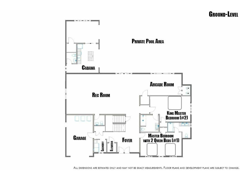 Ground-Level: Rec Room with Arcade Game, and Deck Access; King Master Bedroom (#2) with Smart TV, Attached Full Bathroom with Roll-in Shower; Master Bedroom with 2 Queen Beds (#1), Smart TV, and Attached Full Bathroom with 2 Sink Vanity; Hall Half Bathroom; Cabana Half Bathroom; Laundry Room.