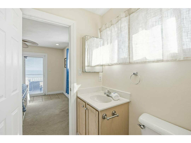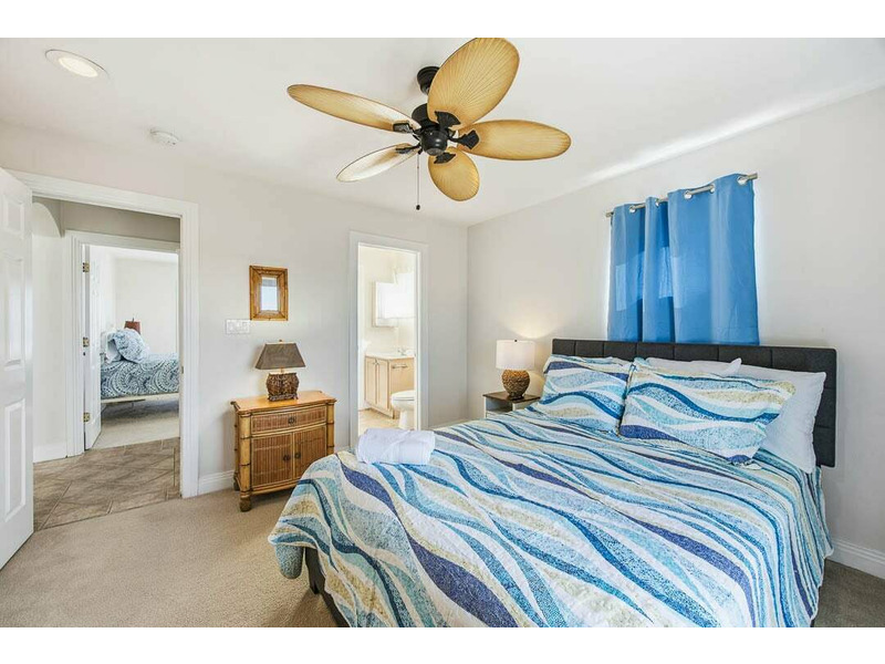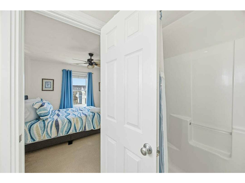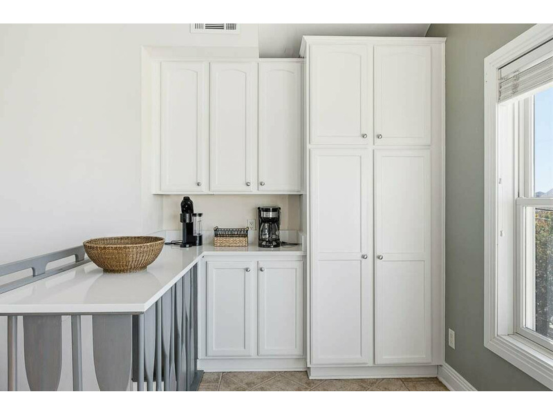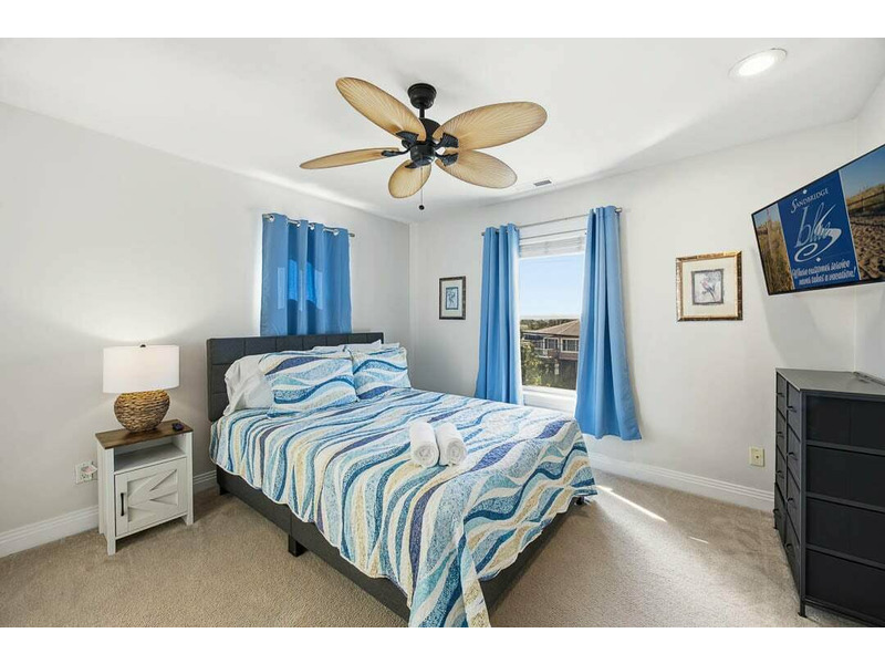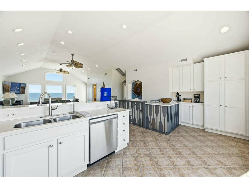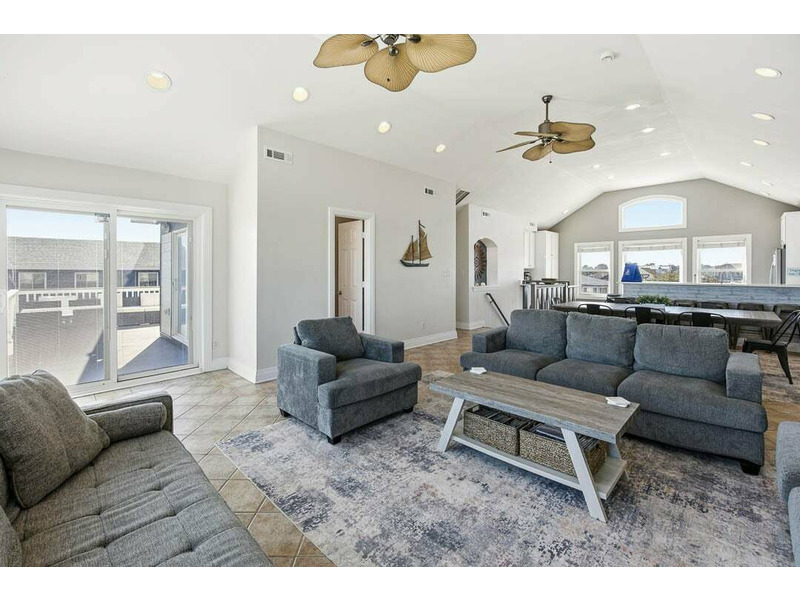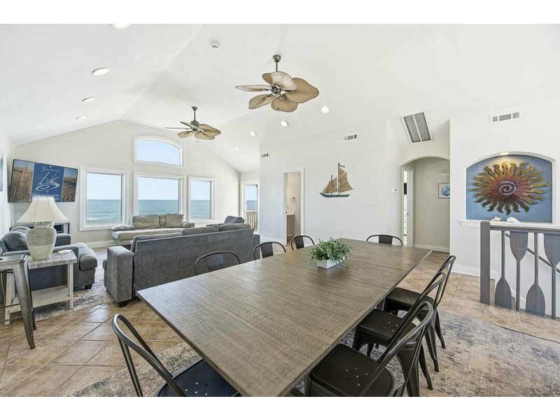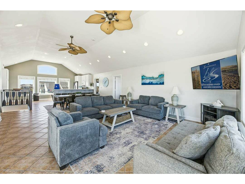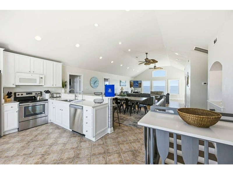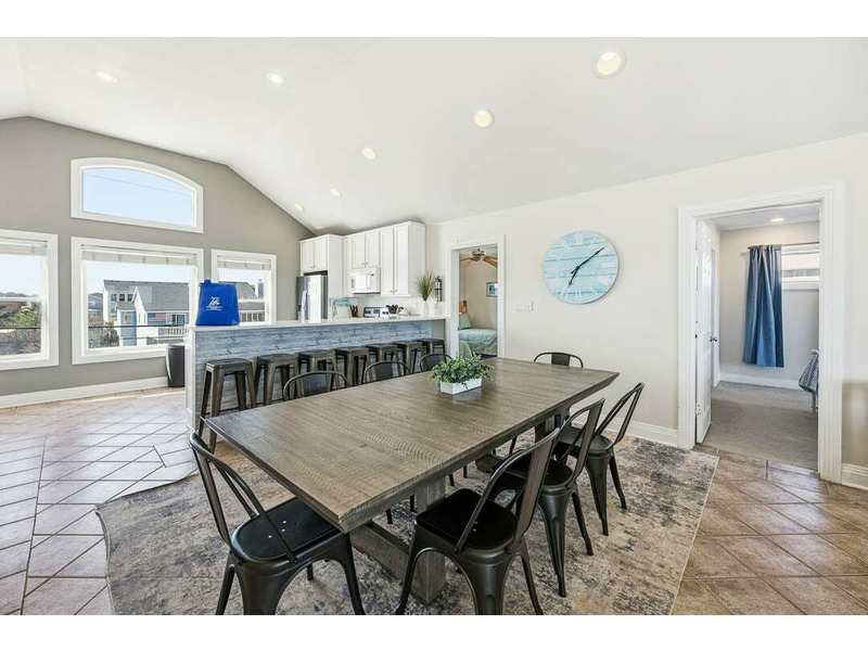 The interior is comfortably updated with quality furnishings, thoughtful coastal details, and plenty of space for groups to spread out. The top-level includes the main kitchen, living area, and dining space, while the mid-level offers an additional living area, a kitchenette with a full-size refrigerator, and its own dining table—making shared meals and snacks convenient at any time of day. Every floor makes smart use of space, from the bedrooms with private deck access to the mid-level gaming area and full laundry on the lower level.